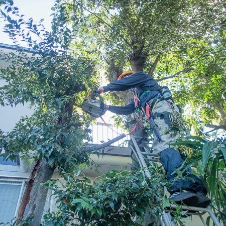 この切っている木は隣地との際に立っているので、反対側に木を落としたくないのです。